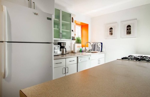 there is a small dining area if you wish to stay in and prepare dinner in the fully-equipped kitchen, or have take out delivered The kitchen includes the all essential appliances, including dishwasher and gas range, and is stocked with cookware, dishware, and utensils.