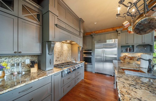 this adirondack custom-designed home features natural design elements throughout, including gorgeous hardwoods shadowed by massive, rough cut cedar timber frame construction Lavish mountain décor and regal furnishings, highlighted by impressionist style artwork, blend seamlessly together for a true rustic elegance. The Great room boasts a grand, tongue and groove lined cathedral ceiling and floor-to-ceiling stone fireplace and TV tastefully tucked into the hutch nearby. The space is free-flow to the gourmet kitchen, which is equipped with stainless appliances, exquisite granite counter tops and backsplash, ornate custom cabinetry and bar seating. The formal dining area is just steps off of the Great room and kitchen and looks out onto expansive ridgeline views. Step out to the abundant covered outdoor living and dining space, with built in gas grill and fireplace, and take in the amazing vistas and clean mountain air.