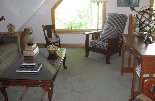 off the hallway is the first level bedroom, furnished in a mission style, with a full-size bed, recliner, end tables and an armoire, as well as satellite tv There is a full bathroom with a fully-stocked linen closet. All the flooring on this level is hardwood.