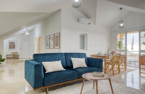 the accommodation is approximately 120 m2 and consists of two bedrooms with a double bed (160 m wide), a living room with a dining table, a kitchen and a bathroom. It has air conditioning with cooling and heating in the bedrooms and living room.