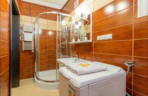 bathroom: shower, sink, washing machine, toilet