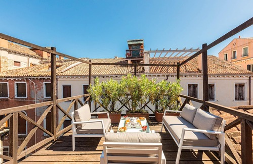 inside, the apartment features three bedrooms and three bathrooms, with a central 'salone' adorned with terrazzo flooring and a murano chandelier The sitting room offers canal views, while the compact kitchen is well-equipped for culinary endeavours. The master bedroom boasts canal vistas and an ensuite bathroom with a bathtub. A private staircase leads to a rooftop terrace, perfect for enjoying the Venetian sunshine. The third bedroom, accessible via the terrace, provides an intimate retreat with an ensuite bathroom.