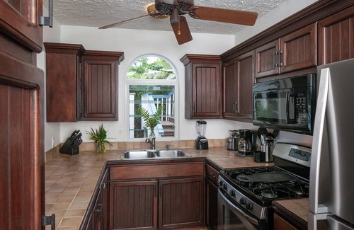 step into the spacious living area, where comfort and style meet Plush seating and thoughtfully selected decor create an inviting atmosphere, while walls of windows bathe the room in natural light and offer uninterrupted views of Coral Bay and the British Virgin Islands. This open, airy space seamlessly flows into the fully equipped kitchen, designed to make island living a breeze. The kitchen boasts full-sized appliances, including a refrigerator, gas stove, oven, microwave, and ample cabinet and counter space—perfect for preparing everything from casual snacks to gourmet meals. A dishwasher, coffee maker, and toaster are also provided for your convenience. Just off the kitchen is a cozy dining area with seating for four, but we highly encourage you to dine al fresco on the expansive deck, where the tropical breezes and stunning scenery will elevate every meal.