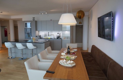 not only the view, but also the furnishings are of the finest: poggenpohl kitchen, gaggenau appliances, automatic sun blinds, tv, wifi and bluetooth speakers are a matter of course