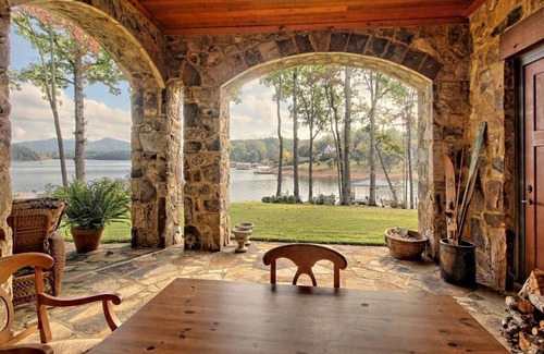 Paradise at Lake Chatuge is luxury at its finest. Enjoy this beautiful lake house with all the extras- you can even bring the boat along to enjoy the private dock. Sit by the firepit enjoying the stars. You'll be right on the water with a beautiful view from the inside and access to a private stretch of beach. Central air conditioning, three gas fireplaces, and one wood fireplace are all set up to to be cozy no matter the weather. Most of the bedrooms have their own en suite bathroom for privacy and comfort. The main floor and terrace floor of the home each feature their own living room space, They also boast full kitchens boasting Subzero refrigerators and Wolf stoves for all your cooking projects. A Keurig, French press, and drip machines are all provided, and there is a popcorn machine for the eight person theater room downstairs. Enjoy the private pool table or pour yourself a drink from the wet bar. Need to get some work done? Make use of one of the two private offices, one even has a fireplace. The first bedroom is on the main floor, and features a sitting area, private deck entrance, and an massive en suite bathroom with double sinks, a standalone shower, a jetted tub, and an amazing large closet. The second bedroom is on the terrace level with a sitting area and a lovely view of the lake, as well as an en suite bathroom with both a stone standalone shower and a shower/tub combination. The rest of bedrooms are on the second floor. You'll find the third bedroom when you turn left at the top of the stairs. This bedroom features a forest view and an en suite bathroom with a stone inlaid shower/tub combination and a natural stone floor. Also upstairs is the fourth bedroom, with its glorious five-window view of the lake. This room's en suite bathroom features stone flooring, a shower/tub combination and stone tilework. The final bedroom is the bunkroom with two sets of twin over full bunkbeds, so there is room for everyone.
