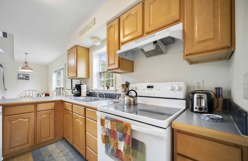 this spotless cottage is light and airy with lots of windows and amazing views of paradise lake It offers everything you need to enjoy your vacation - just bring your groceries! The master bedroom adjoins the bathroom on the main floor and has a queen sized bed. The upstairs loft has 2 queen beds. The main floor has an open design with living room, dining room and kitchen. There is a very large deck drenched in sun which faces the lake. The cottage features central air, a new washer/dryer, DISH satellite, WIFI and a water treatment system to remove that 'country water' that so many cottages have. We also offer 2 bikes for your use.