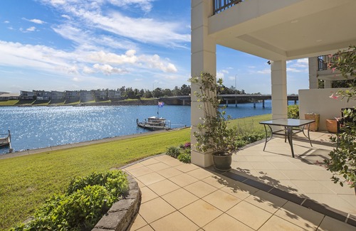 the sleek contemporary kitchen comes equipped with quality appliances, including a dishwasher and microwave, flowing into a spacious dining area and a beautiful sunken lounge Take in stunning canal views from both the main bedroom and the living area.