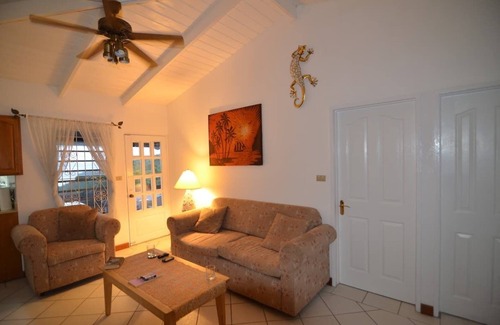 Spacious one bed property, clean and airy with high vaulted ceilings. Views of Dickenson Bay from verandah. Wifi, aircon, parking. Shared pool set within tropical gardens. Just 15 mins from airport. 15 mins to St Johns city. Registered with ministry tourism.