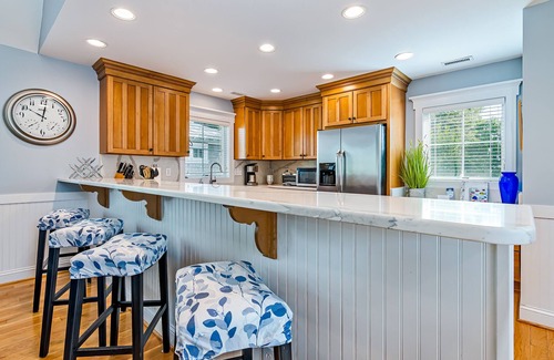 the house, ideal for a two-family vacation, is decorated in a timeless coastal style with comfortable bedding and furniture The reverse floor plan features a 2nd floor screened-in porch to take advantage of the sights of the adjacent park, and the sounds of the nearby ocean.