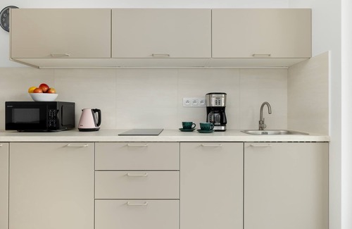 designed for four people, the interior is the perfect place for a family getaway or a stay with friends Bright, calming colors and a functional layout encourage relaxation and spending time together. The living room, with a sofa bed and kitchenette, opens onto a balcony, which is also accessible from the bedroom. The outdoor space is furnished with balcony furniture, allowing you to enjoy your morning coffee outdoors or a moment of respite after a busy day. The bedroom offers a double bed and direct access to natural light, while the living room invites you to relax in front of a Smart TV with satellite channels. The kitchenette is equipped with essential appliances, such as an induction cooktop, refrigerator with freezer, dishwasher, microwave, toaster, kettle, and filter coffee maker. The bathroom includes a shower and hairdryer. Air conditioning in the living room, high-speed internet, and amenities to make everyday life easier, including a portable clothes dryer, vacuum cleaner, iron, and ironing board. The property is equipped with an elevator, and parking is available right below the building, under a covered roof, with easy access and a 2-meter-high gate. Pets are welcome for an additional fee. The bright, refined interior creates an atmosphere conducive to relaxation, while the subdued aesthetic and access to all amenities ensure a leisurely and completely relaxed stay.