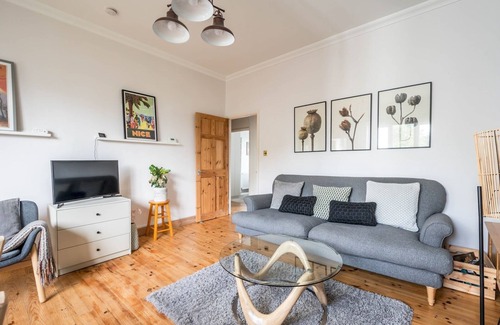my comfortable victorian flat has some original features, high ceilings, a decorative (unused) brick fireplace, and wooden floors throughout most of the property It is homely in feel, with character, and is much loved. There is eclectic artwork and artifacts, potted plants, and magnets from my travels which have been left in place for guest enjoyment.