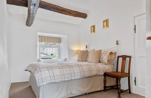 the second bedroom has stunning oak beams and is oozing character It has a double bed, wardrobe, chest of drawers and a full length mirror. A large mirror is positioned over the drawers so this can be used as a dressing table. There are windows to the front and rear of the room, giving lots of natural light and lovely distant views. There are blinds at the windows with blackout lining to make sure you get a great nights sleep.