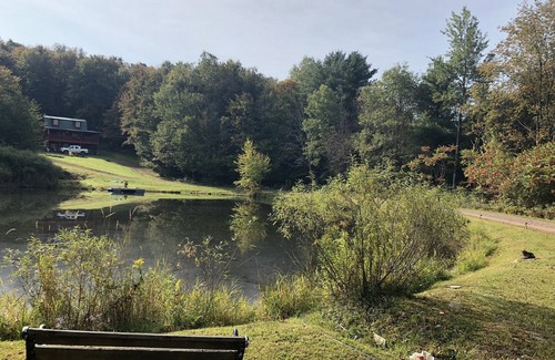 tucked away on a hilltop overlooking a serene pond, this is the perfect place to unwind and make lasting memories Cross a beautiful bridge that spans a roaring stream and step into a peaceful world all your own.