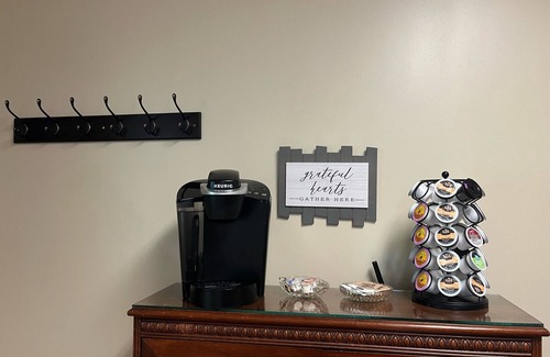peaceful hills retreat cottage has an open kitchen and dining room complete with a fridge, stove, oven, microwave, toaster, vitamix blender, and a keurig stocked with coffee and tea The kitchen has pots and pans, plates and bowls, coffee mugs and glasses, silverware and utensils. It has a living room with a piano & books, a family room with popcorn, games and a flat screen TV, and three bedrooms fully stocked with two pillows per person, plus sheets, comforters, and extra blankets.