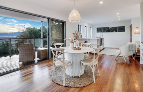 cooinda studio features an open-plan living, kitchen, dining, and office nook, all enjoying expansive views of the valley and beyond to the coastline