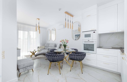 a prestigious apartment in the seaside town of sianożęty is the perfect place for a family or couple seeking a relaxing stay by the baltic sea Designed in a bright, modern style with elegant accents, it can accommodate up to 4 guests. At the heart of the apartment is a cozy living room with a kitchenette, ideal for spending time together. The living room, decorated in white and gray with subtle golden accents, creates an atmosphere of modern elegance. A double sofa bed provides rest after a day full of experiences, while the TV with internet channels and HDMI cable ensures entertainment. The kitchenette is fully equipped with modern appliances, including an induction hob, oven, dishwasher, capsule coffee machine, toaster, microwave, and blender, and the dining table with four chairs allows for shared meals. One of the walls in the living room is decorated with a leaf motif in white and gray shades, giving the interior a unique character. Both the living room and the bedroom open onto a spacious private terrace with balcony furniture, perfect for morning coffee or evening relaxation. The bedroom features a comfortable double bed, with a navy blue wall behind the headboard adding a strong color accent. The bathroom is kept in light tones, with contrasting black and gold tiles by the sink, while the remaining walls are finished in a white and gold palette, emphasizing the modern and luxurious character of the interior. Guests also have access to a hairdryer, built-in washing machine, air conditioning, smoke and carbon monoxide detectors, vacuum cleaner, iron, and ironing board. The apartment also includes a parking space in the underground garage, providing an additional convenience.