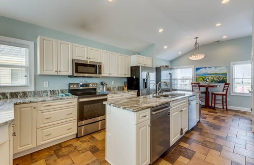 make sure you bring your furry family friend because we welcome pets to this property Three family room gathering areas allow you to pick your style: Great Room filled with sunlight, an 85” TV and ocean views allows you to mingle with the cooks or relax overlooking the ocean and your private pool. The mid-level family room has an 85” TV, seating for 12 and it has access to the deck with ocean views, or you could pull the curtains and have a movie night with the huge TV. The ground-level recreation room has ample seating for the party, with a regulation size pool table and another 85” TV. The kitchenette keeps the kids happy when you stock it with snacks...and the full-size refrigerator is easy to access from the pool through the recreation room or the cabana bath. The kitchen has plenty of space for all the cooks. The eat-in café table in the kitchen is a nice spot for kids to have lunch or their private space during dinner. the center island and peninsula offer additional workspace, seating and storage!