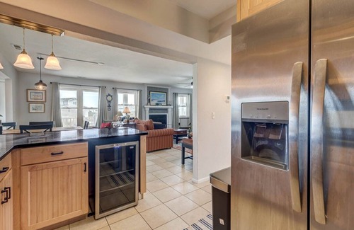 mid-level: living room with tv, fireplace not operational; dining room with table (seats 8); kitchen with bar (seats 3), blender, coffee maker (drip), dishwasher, microwave, oven/stove, wine cooler, refrigerator, toaster, pots, pans, dishes, and cooking essentials; queen bedroom with tv; hall full bathroom