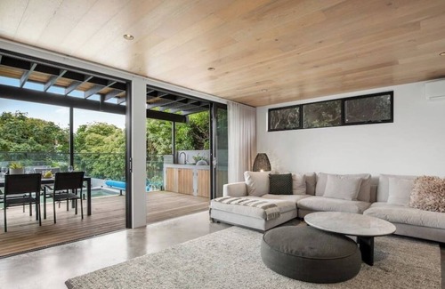 guests will love the gentle sea breezes flowing through sheer curtains on both al fresco decks, with floor to ceiling stacker doors opening on both levels and natural light softly touching the chic interiors, enriched by mink grey australian timber All luxury amenities have been accounted for with climate-controlled cooling, an open fireplace, double glazed windows, soaring light-wells above the staircase and main bathroom, a wraparound entertaining deck with 180-degree water views, gourmet stone kitchen with a suite of quality appliances including wine fridge, stone island bench seating up to 4 guests, meals area seating up to 8 guests and sumptuous lounge with wood fireplace. Entertain family and friends on the entry level alfresco dining deck with outdoor kitchen stepping down to the opulent heated in-ground swimming pool with poolside lounge and grass lawn beyond.