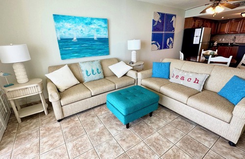 this bright, airy home welcomes you with a breezy open-concept living area, furnished with two sofas, and a smart flat-screen tv for your favorite streaming nights Large windows bring the sunshine in, while soft neutral tones and ocean-inspired decor create a relaxing beach vibe.