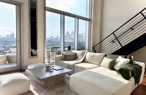 our penthouse features two beautifully appointed bedrooms and one and a half pristine bathrooms, providing ample space for relaxation and comfort The open floor plan, high ceilings, and meticulous cleanliness make this loft a sanctuary of luxury. Whether you're unwinding after a day of exploring or entertaining friends, this space offers the perfect blend of style and functionality.