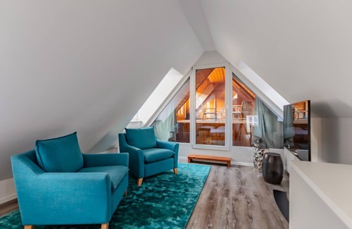from the uplifted bedroom, which is equipped with a custom made king-size bed made out of solid wood, you will have a direct view to the loggia made out of solid wood as well Where you can have a cozy breakfast to start the day with or drink a quality glass of wine to enjoy the evening. In addition, the bedroom offers a small lounge with two futons, a smart TV with access to the internet and cable channels.