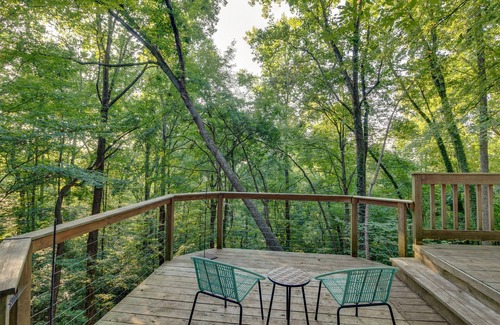 Flanked by an old hardwood forest and up a secluded curving road, The Treehouse is a picturesque, charming A-frame renovated in 2022. An oasis in the middle of all the popular vacation destinations, it is close to downtown Knoxville and all the restaurants, shops, and city attractions. The beautiful stained glass entry doors, vaulted ceilings, skylights, and expansive windows welcome in the private, wooded property. Two bedrooms, new bathrooms, decks, and stylish furnishing will delight you..