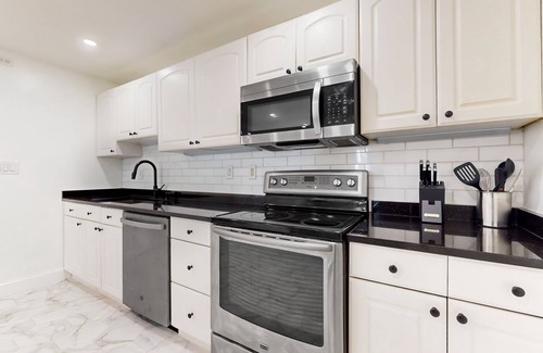 bright, spacious, and entirely welcoming, the interior of your stay boasts all of the homey amenities you love to have while traveling The living room's large sofa and smart TV offer the perfect combination for streaming sessions, whereas the stainless steel kitchen makes cooking a breeze! Whether you are dining over a homemade meal or takeout, both the breakfast bar and quaint dining table provide comfortable eating arrangements.