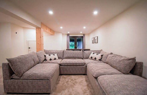 indulge in movie nights and relaxed lounging in the bear's den, a cozy retreat adjacent to the lower bedroom Unwind on the oversized sectional sleeper sofa, perfectly suited for both relaxation and accommodating extra guests. Set the mood with dimmable inset LED lighting, creating the ideal ambiance for movie night. Enjoy added convenience with the en suite full bathroom, ensuring comfort and privacy during your stay.