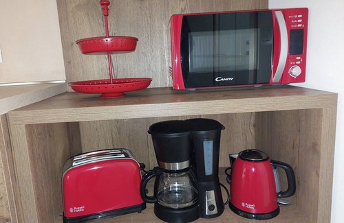 a living room, a fireplace, air conditioning, and a desk are featured at this 2-bedroom, 1-bathroom rental Bathroom amenities include a hair dryer, a bidet, and towels. The kitchen is equipped with a stovetop, a refrigerator, and a dishwasher, as well as a coffee maker, an electric kettle, and a microwave. And there's access to laundry facilities, so you can even pack a bit lighter.