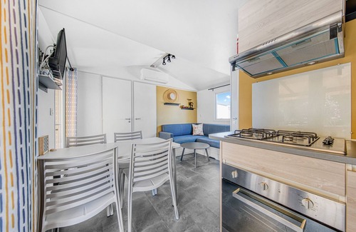this single-storey mobile home offers a sunny private terrace with garden furniture, barbecue, and outdoor dining area, a living room with sofa bed and flat-screen tv, a fully equipped kitchenette (hob, oven, microwave, fridge, coffee maker, kettle, toaster, utensils), two bedrooms with storage, wardrobe, and dressing room, as well as a private bathroom with shower, hairdryer, and toilet