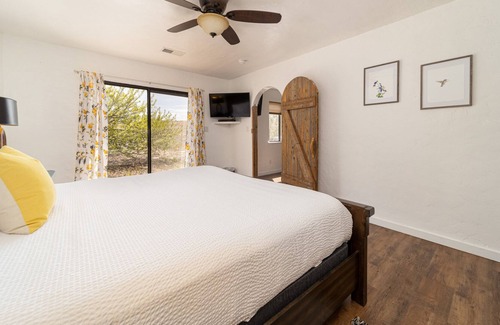 when you enter this endearing cottage, you are instantly drawn in by its charming layout and decor Immediately to your left, you will find a full bathroom with shower that has everything you will need for your stay. As you continue down the entrance, to your left you will be greeted by the most well-equipped yet adorable kitchen that has everything from a full refrigerator to a dishwasher and oven, to a bar area with stools that opens up to the living space. The living room is spacious and well-lit with a comfy sofa that pulls out to become an extra bed, and there's also a satellite TV for your enjoyment. To the left of the living room, is a lovely bedroom with a king-sized bed, satellite TV, walk-in closet, and sliding glass door that opens to the private patio area. This patio area is secluded and equipped with a fire ring, BBQ grill, picnic table and tiki lamps. this little hideaway will become a cherished favorite!