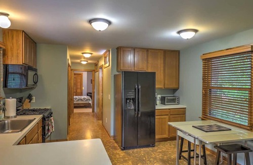 This secluded PET FRIENDLY home is powered by our solar farm and overlooks Mr. Waddles Pond. You will discover the allure of sustainable living while enjoying high-end amenities, comfortable furnishings and a wooded paradise right out the front door. Towering trees, an exterior spiral staircase and charming bird feeders welcome you. Settle in and sit back in the cozy living room, equipped with 2 of 5 flat screen smart TV's with 120MBPS Fiber-Optic Wifi. The fully equipped kitchen has a dining table and a breakfast bar. Refresh under solar-heated steamy water in 1 of 2 pristine full bathrooms including fresh plush towels and eco friendly soaps. For rest and rejuvenation, 4 plush mattresses with luxury linens, comfortably sleeps 7 guests. The private bedroom on the second floor can be set up with 2 twins or 1 king bed. The common space bedroom has a queen bed. The sitting area has a twin size hide-a-bed sofa. The main floor bedroom has a full size bed and an entrance door that leads out to the rear deck and handicap ramp. The deck on the the front of the house has a spiral staircase up to the second story balcony. Very close to the home there is a covered pavilion with charcoal grills and a picnic table. From the patio enjoy stunning views of the private duck pond and wooded hillsides. Take a walk across the boardwalk as you meander through lush pathways beneath towering tree canopies and beside bright, blooming flower beds..