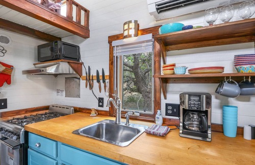 Hound Hollow is a pet friendly tiny escape located in Dripping Springs. This 1-bedroom Tiny House is a unique and cozy retreat for couples looking for a private and peaceful getaway. Boasting Hill Country views, this Tiny House is the perfect home base for exploring the area and all its beauty. The front porch is the ideal spot for relaxing and taking in the majestic scenery as the sun sets over the horizon. An unforgettable experience awaits inside The Hound Hollow with a fully equipped kitchen, a cozy bedroom, and all the amenities you need for a comfortable tiny stay.