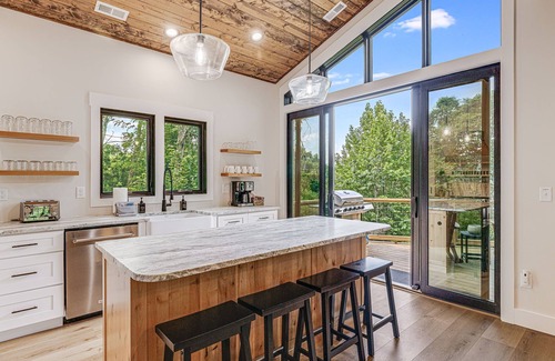 Unwind at Serenity Peak Lodge in the beautiful Smoky Mountains near Maggie Valley, NC. This luxurious and modern two-story home welcomes you with a comfortable, contemporary living space with double sliding doors to bring the mountain breeze inside. Find your favorite spot on the deck, whether it's lounging in a rocker or working the grill, the peaceful scenery is guaranteed to help you relax. Unleash your inner chef in the fully-equipped kitchen with a sizable central island. In the winter months, share quality time next to the warmth of the wood fire while watching your favorite movies.