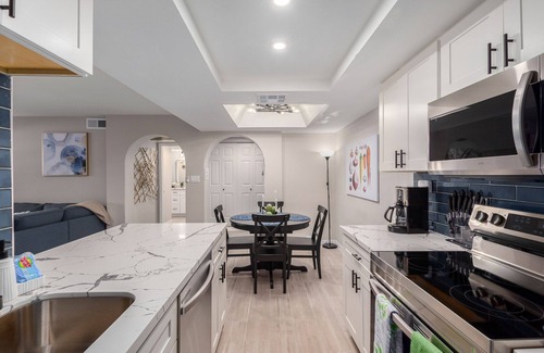 Welcome to your personal slice of paradise in the heart of Phoenix! Get ready to dip your toes into relaxation and soak up the sun in this brand-spanking-new listing that’s just bursting with charm and comfort. Nestled in a community so fabulous, it's practically a vacation within a vacation, this ground-floor condo is your ticket to ultimate convenience and luxury. Just imagine stepping out of your front door and voila, you’re greeted by the inviting sparkle of the pool, beckoning you for a refreshing dip or a leisurely lounge session. It’s like having your own private oasis, only with way better amenities and way less maintenance. So grab your sunscreen, dust off your favorite pool floatie, and get ready to make a splash in the good life – you’ve earned it! Key Features: Location: Nestled in the heart of North Central Phoenix, our condo offers convenience and comfort. Accommodation: Ideal for couples or families, our condo boasts two separate master suites, each equipped with brand new king beds and flat-screen TVs. Need extra sleeping space? A queen-size inflatable mattress is available, accommodating up to 6 guests. Amenities: Enjoy modern living with stainless steel appliances, tile flooring, quartz countertops, custom shower, and stylish furnishings throughout. And don't forget the convenience of in-unit washer and dryer! Outdoor Living: Savor your morning coffee or unwind with a glass of wine on one of the two private patio areas. Community: Dive into the resort-like amenities of our gated community, including three pools with hot tubs, BBQ grilling areas, basketball, pickleball court, and tennis court, and scenic walking paths enveloped by lush greenery and towering palm trees. Entertainment: Stay connected with fast internet and cable TV, or grab the provided pickleball paddles and balls for a friendly match on the courts. Location Highlights: With Phoenix Sky Harbor Airport just 20 minutes away and downtown Phoenix within easy reach, you're perfectly positioned to explore the Valley of the Sun. Plus, enjoy a myriad of dining and shopping options just minutes from your doorstep. Activities: Whether you're into golfing, hiking, or simply soaking up the sun, our condo puts you within reach of numerous outdoor adventures. This fully renovated, stylish retreat offers the perfect blend of comfort, convenience, and recreation. Book now and make unforgettable memories in Phoenix!.