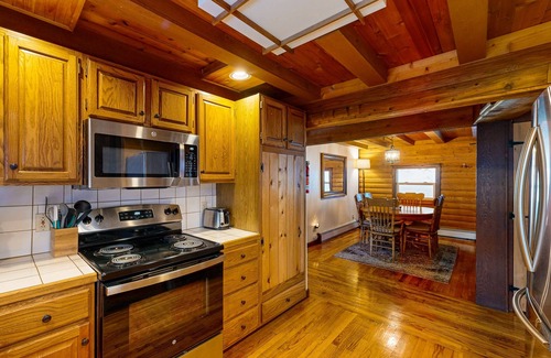 this pet-friendly property has a variety of sleeping arrangements, including a double bed, twin bunk bed, and a master loft with a queen bed and en suite bath Enjoy modern amenities and a well-equipped kitchen with a coffee maker, dishwasher, and more. Stay cozy on chilly nights with the wood stove, and take in the breathtaking views from the top balcony or deck.