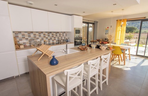 located in the picturesque village of pierrefeu-du-var, in the heart of the maures mountain range, this contemporary 100 m² villa, beautifully decorated, is the perfect choice for a family vacation with two children or for two couples
