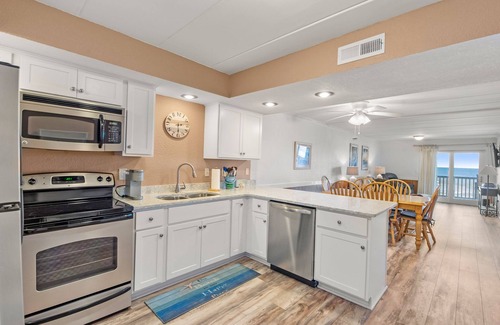 PierView 208 is a newly renovated oceanfront condo offering stunning views of the Atlantic and a prime location just south of Jennette's Pier. Unpacking luggage and groceries will be a breeze using the building elevator. The living area leads out to a private oceanfront deck where you can watch the sunrise and listen to the sound of crashing waves. This oceanfront condominium provides guests with direct access to the beach, as well as a community pool. Family-friendly features include a kiddie pool and playground.