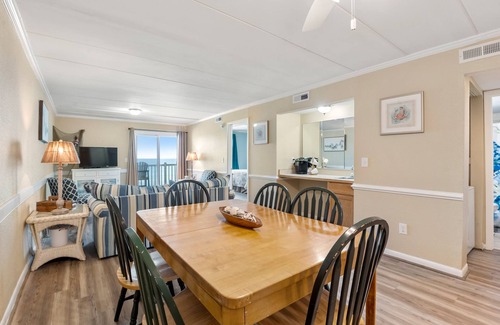 The name says it all! PierView 308 offers stunning views of the Atlantic and is located just south of Jennette's Pier in Nags Head. This 2-bedroom condo is a top-floor end unit for more privacy and the best possible view. Don't worry about the climb - use the building elevator during your stay, which will make unpacking luggage and groceries hassle-free. The living area leads out to a private oceanfront deck where you can watch the sunrise, listen to the waves crash, and enjoy the ocean breeze. This oceanfront condominium provides guests with direct access to the beach, as well as a community pool. Family-friendly features include a kiddie pool and playground.