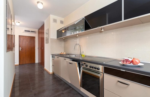 the fully equipped studio apartment can host up to 2 people It consists of a living room with a kitchenette and a bathroom with a shower. There is also a big balcony available. In spacious living room you will find a sofa bed and a desk with a chair, which will be graet place to work or study. You can also relax thanks to more modern entertainment: multimedia in the apartment include a flat-screen TV. Other amenities include a comprehensive set of kitchen and bathroom appliances (washing machine, coffee maker, dishwasher, hair dryer) and a welcome package of cosmetics, towels and bed linen. There is also an assigned parking place in the outdoors parking lot for guests traveling by car.