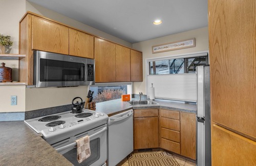 relax at the pilot butte view retreat, a two-bedroom two-bath in mt Bachelor Village Resort, offering stunning views of Pilot Butte and Bend. This lower-level unit accommodates up to 6 guests with a king suite, queen suite, and queen sofa sleeper. The bright, open living area features expansive windows, a new leather sleeper sofa, and a 50” Smart TV above the gas fireplace. Enjoy breakfast on the deck with panoramic views or take advantage of resort amenities like the pool (March-September) and year-round spas.