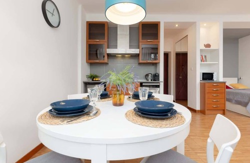 this fully equipped studio for 4 people has been designed to create a homely and welcoming atmosphere in a great location in warsaw It is the perfect choice for a stay in the centre of the capital with family or friends. The space is divided into a studio with a kitchenette and a bathroom with a shower. There is a comfortable double bed and a sofa bed. The studio is bright and functionally furnished to make your stay as comfortable as possible. The unique aura of the apartment is complemented by an attractive interior colour scheme with stylish decorative elements. The apartment is steeped in the historic atmosphere of the capital: its windows overlook charming townhouses. At the same time, the studio is equipped with modern conveniences such as free Wi-Fi access and a cable Tv. The kitchen area has a table and chairs for sharing meals. The apartment is fully equipped with all the necessary kitchen utensils and appliances (coffee maker, microwave, dishwasher) and bathroom amenities (washing machine, hairdryer) to ensure a comfortable stay. To facilitate the start of each night's stay, toiletries (soap, shampoo and shower gel), towels and bed linen are provided free of charge. The location of the apartment will certainly allow you to feel the atmosphere of the city among the main attractions of the capital. These advantages make the apartment an ideal choice for a carefree stay in Warsaw.