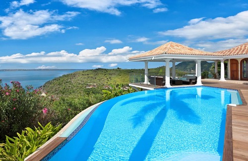 entering the villa, the stunning panoramic views dazzle with a brilliant sweep of tropical green mountains and endless blue sea and sky Anguilla is on the horizon. Just below the deck, you see waves crashing on the beach. Surrounding the villa are colorful gardens filled with tropical flowers as well as papaya and banana trees. The blue, endless heated pool connects the amazing view to the villa. The spacious horseshoe-shaped epi wood terrace is filled with outdoor dining and seating to enjoy the view and wonderful breezes. Little seating niches and a large covered gazebo offer quiet places to relax.