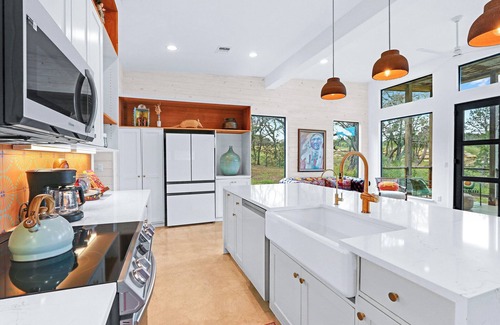 Step into the whimsical embrace of Wild Candy Farm - Plum Wild, as seen in the NY Times. A charming retreat nestled in the verdant heart of Wimberley, Texas. This enchanting guest house invites families and friends seeking a serene escape to bask in its blend of rustic charm and modern comfort.