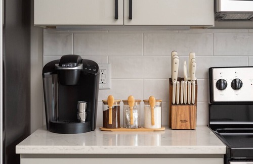 ★ between the bedrooms, guests will enter into a spacious chef`s kitchen and a cozy living room with a smart tv (hulu live, movie & sports bundle included), a comfortable couch, and two snug accent chairs