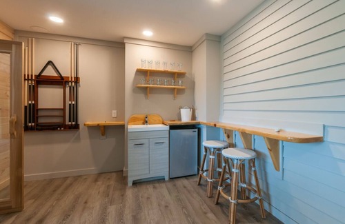 descend to the lower level (where the floors are also warmed by radiant heat) with game room with a pool table, wet bar, smart tv, sauna, bedroom/den and another full bath with tub/shower Large sliders on this level access the outdoors and luxurious salt water hot tub. Walk down the steps to a private dock with a small private sandy beach area. There you'll find for your use a row boat, 2 kayaks, 1 paddleboard and 4 adult & 2 youth life vests.
