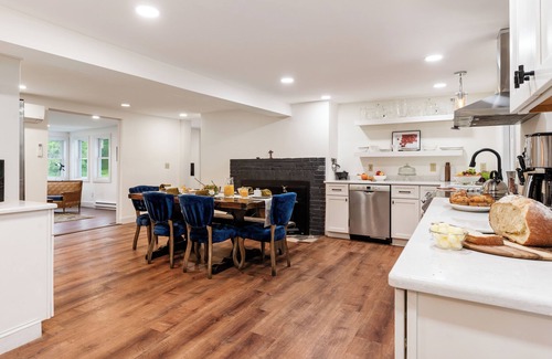 inside, the home's classic design and comforting layout make settling in effortless Four bedrooms and two full bathrooms offer space for families or groups, with thoughtful touches throughout: sun-drenched windows, natural textures, and just enough quirk to make it feel personal. The living room invites connection with plush seating, a piano for impromptu melodies, and a TV for low-key nights in. The open dining area is anchored by a large table where meals, conversation, and board games can stretch long into the evening.