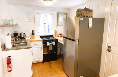 the cottage’s galley kitchen, though compact, is clean and efficient, outfitted with new appliances and all the essentials for cooking at home Whether you're preparing a romantic dinner in the adjacent dining area or enjoying a casual breakfast at the bar—also a great spot for puzzles, games, or late-night chats—Willow Haven invites you to slow down and savor the simple pleasures.