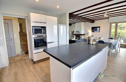 GR.FL : Entrance hall. Fitted kitchen. Lounge-diner. Bedroom 1: king-size bed. Shower room. WC. UPSTAIRS: Bedroom 2: twin beds. Bedroom 3: twin beds. Bedroom 4: double bed. Bathroom. WC. Internet access. Basement: 2 garages, one with table tennis table. Large L-shaped patio with wonderful sea views, small lawned area. Baby equipment : travel cot, high chair, bath, changing mat, booster seat and fireguard. End-of-stay- cleaning available. Local tourist tax payable directly to the owner. A spacious, Neo-Breton style house with large patio areas and panoramic sea views, great for a holiday with family or friends and for exploring the area between the Pink Granite Coast and the Côte du Trégor. Port l'Epine beach is 200m away and the wild, unspoilt peninsula of Port l’Epine is nearby..